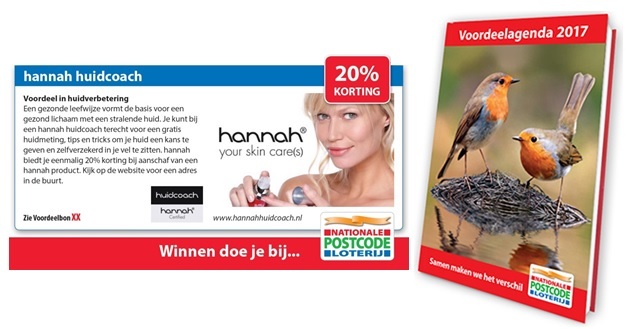 Jaarlijks verzorgt de Nationale Postcode Loterij een Voordeelagenda boordevol aantrekkelijke aanbiedingen en kortingen voor haar 2,4 miljoen leden. De Voordeelagenda 2017 is extra interessant, want ook de hannah huidcoach geeft dit jaar korting!