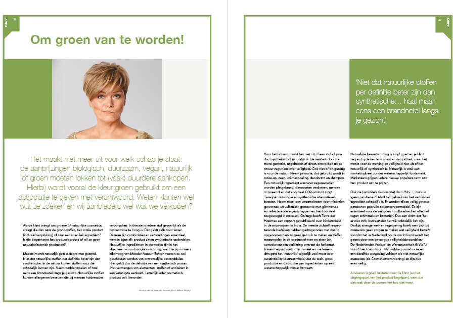 Monica van Ee, directeur van hannah heeft een duidelijke mening betreft groene cosmetica, hierover schreef ze een interessante column in de oktober-editie van L 'essence: