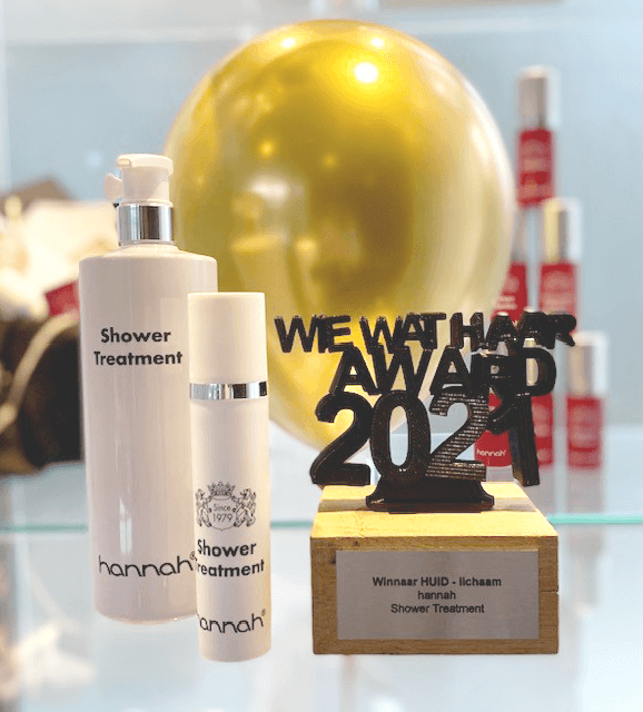Wij doen zelf de productontwikkeling en het traject van idee tot product duurt ongeveer negen maanden. Dus ieder product is als een hannah “kind” voor ons. Dan is een award een bekroning op je werk. De Shower Treatment is een unieke, hydrofiele -dus met water vermengbare- doucheolie met een schuimvrije samenstelling, zodat de natuurlijke beschermlaag van de huid gerespecteerd wordt en niet uitdroogt. En zoals in het juryrapport staat, hoef je na het douchen geen bodylotion meer te gebruiken. Een terechte winnaar, ook in onze ogen.