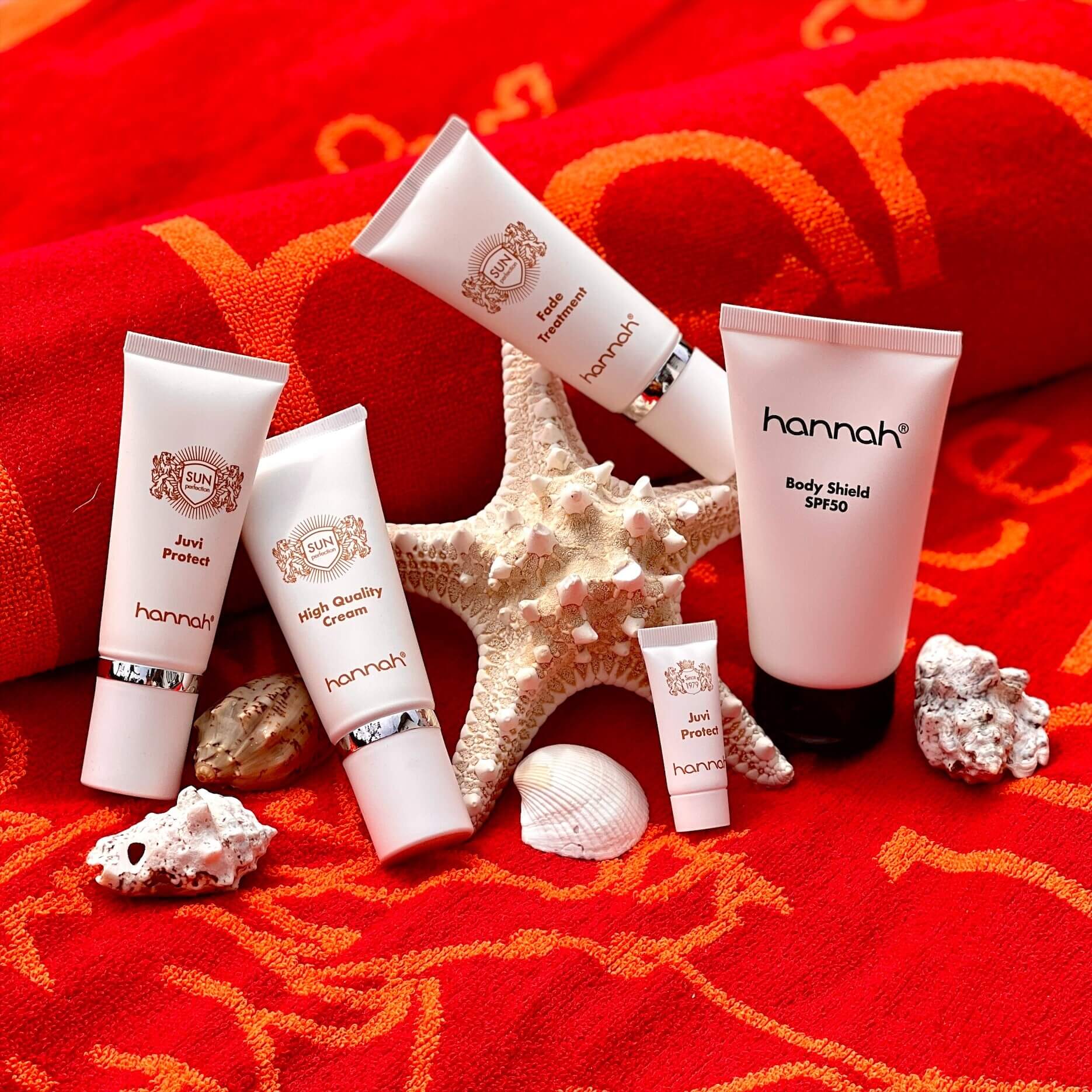 De complete lijn heeft een restyling ondergaan en zijn verpakt in milieubewustere en minimalistische tubes zonder doosje. De Fade Treatment, High Quality Cream en Juvi Protect zijn hierdoor handzamer en nog makkelijker mee te nemen tijdens een heerlijke stranddag of op het terras. Naast de restyling is de samenstelling van de Sun Perfection producten en ook de Body Shield verder doorontwikkeld en gefinetuned. Hierdoor is de zonnelijn van hannah geheel up to date op basis van de publieke opinie over duurzaamheid en de wetenschappelijke onderbouwing betreft de norm van de hedendaagse milieueisen. Deze producten zijn dus volledig vegan, vrij van microplastics en duurzaam verpakt. Natuurlijk met behoud van hoge kwaliteit op de huidverbeterende werking en feeling van deze populaire producten.
